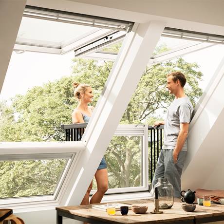 Zwei nebeneinander eingebaute Zwillingsfenster als ein großes Fensterelement. Die Zwillingsfenster und ein Lichtband zusammen ergeben ein Quartett. Den Schritt ins Freie können sie mit einem Cabrio Dachfenster genießen.