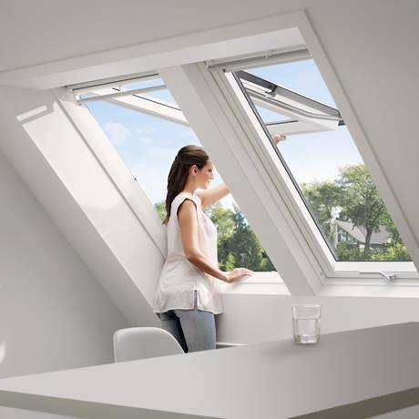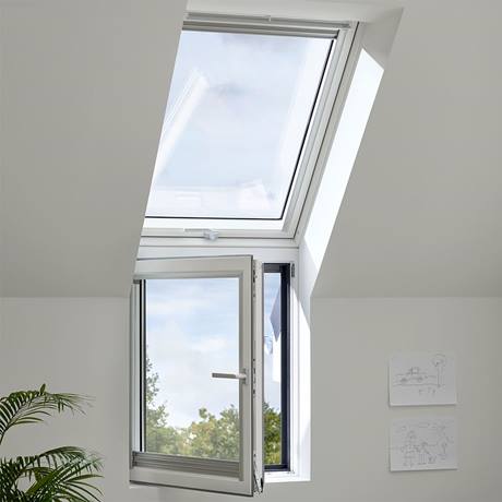 Bei beiden Dachfenstertypen, also bei den Schwingfenstern als auch bei den Klapp-Schwingfenstern können Sie die Außenseite problemlos um 180° nach innen schwenken und bequem und sicher am Blendrahmen arretieren. So hat man die Hände frei und kann in dieser Stellung die Außenscheibe sicher reinigen.