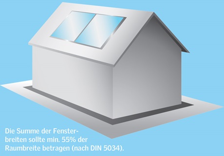 Die Summe der Breite aller Fenster sollte mindestens 55% der Breite des Wohnraums betragen. Das entspricht den Forderungen der DIN 5034 „Tageslicht in Innenräumen“. Beispiel: Die Raumbreite beträgt 5,00 m. Dann sollte die Summe aller Fenster in der Breite mindestens 2,75 m betragen.